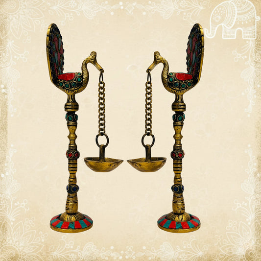 Set of 2 Brass Hanging Peacock Diyas with Chain – Multicolor Deepam Oil Lamps, 16-Inch