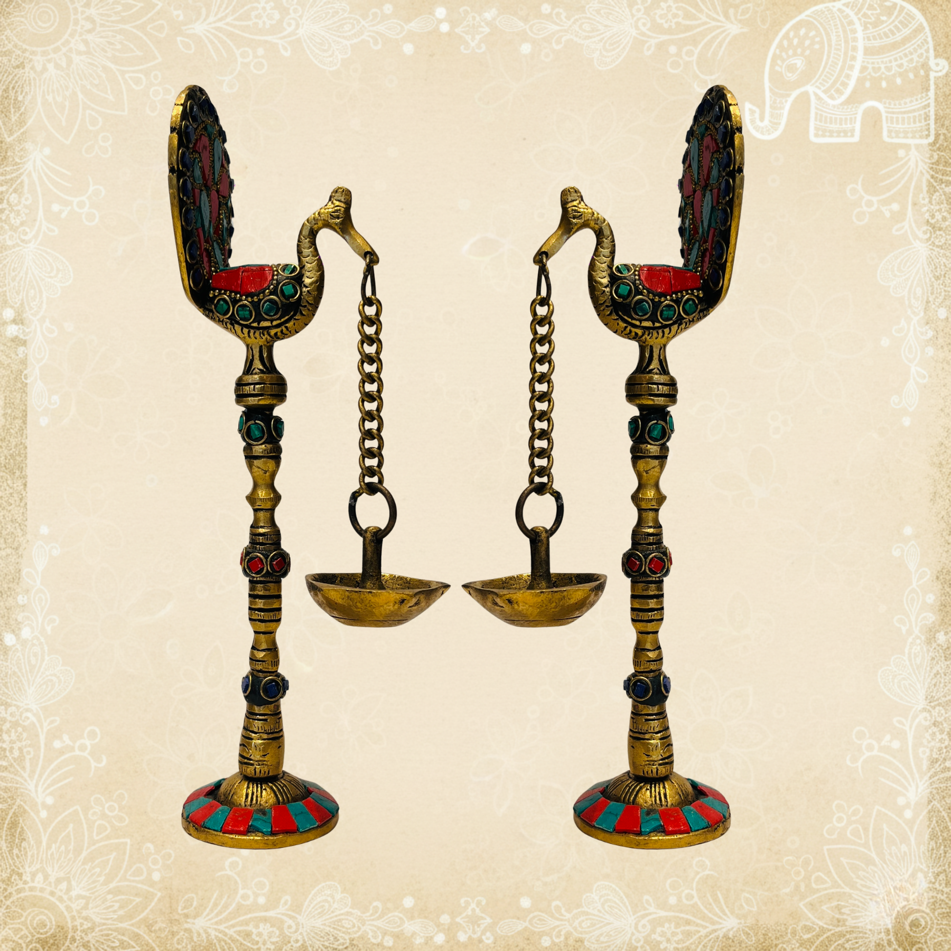 Set of 2 Brass Hanging Peacock Diyas with Chain – Multicolor Deepam Oil Lamps, 16-Inch